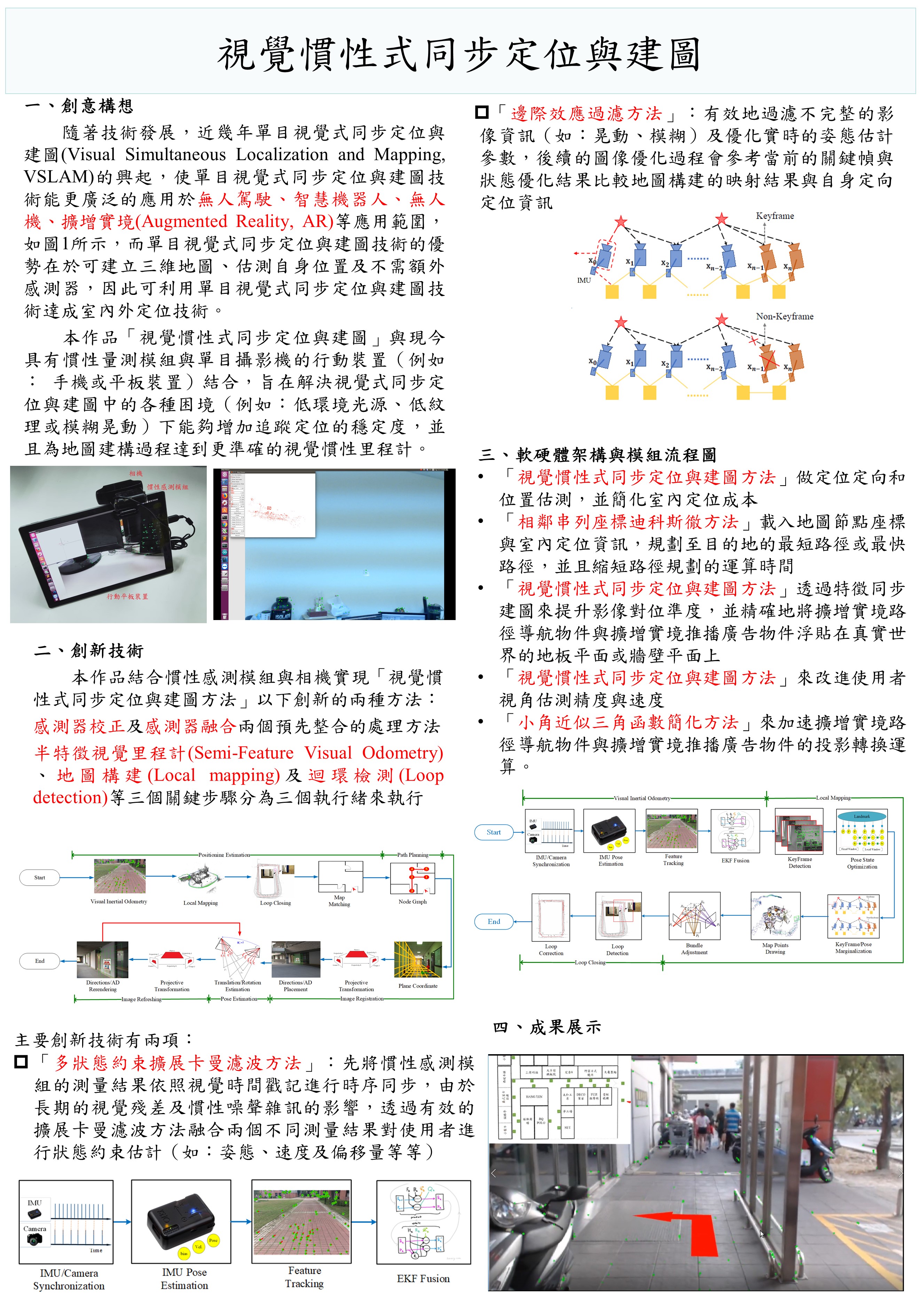 基於再同步卡曼濾波融合方法的視覺慣性式同步定位與建圖及其室內外擴增實境路徑導航與推播廣告裝置 |