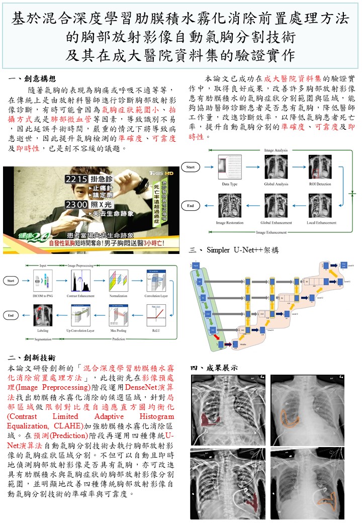 基於混合深度學習肋膜積水霧化消除前置處理方法的胸部放射影像自動氣胸分割技術及其在成大醫院資料集的驗證實作 |
