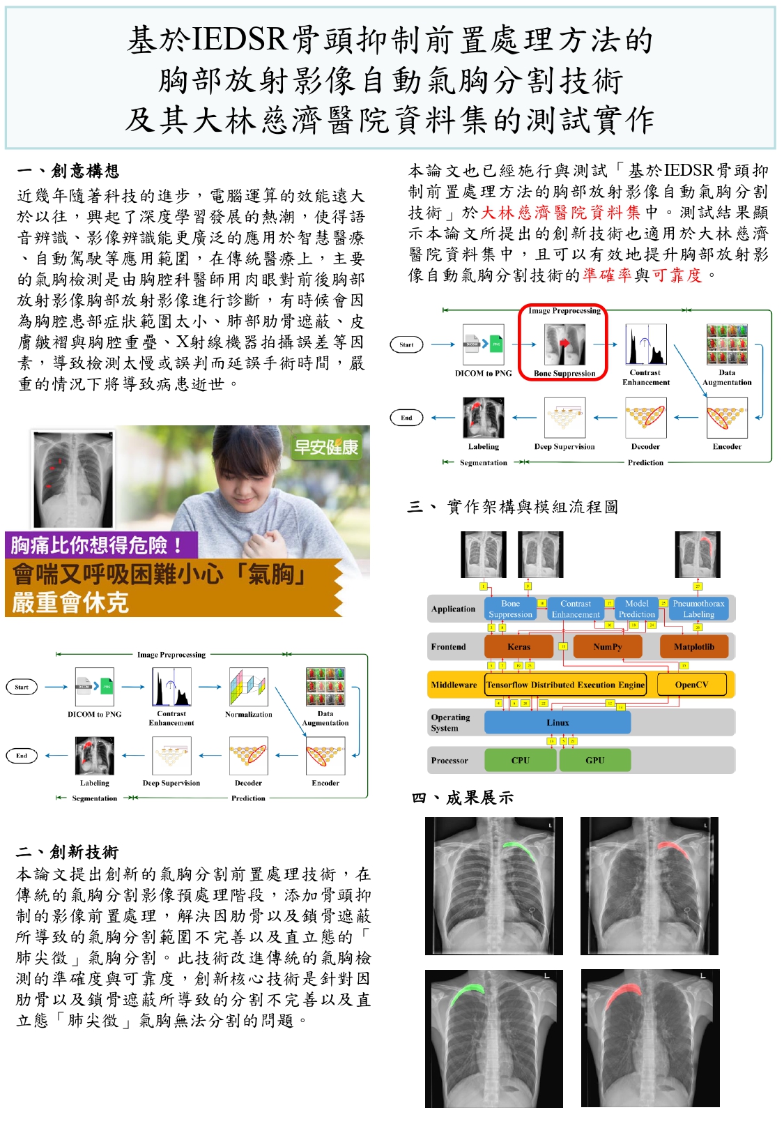 基於IEDSR骨頭抑制前置處理方法的胸部放射影像自動氣胸分割技術及其大林慈濟醫院資料集的測試實作 |