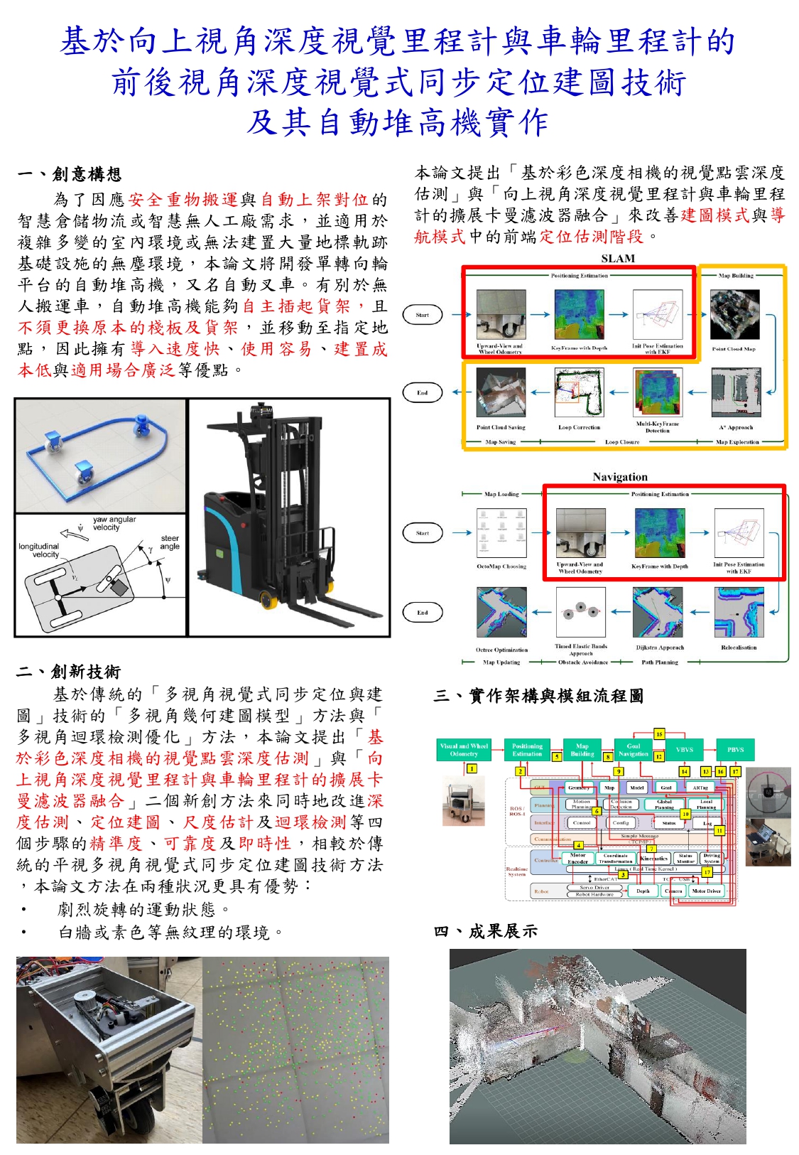 基於向上視角深度視覺里程計與車輪里程計的前後視角深度視覺式同步定位建圖技術及其自動堆高機實作 |