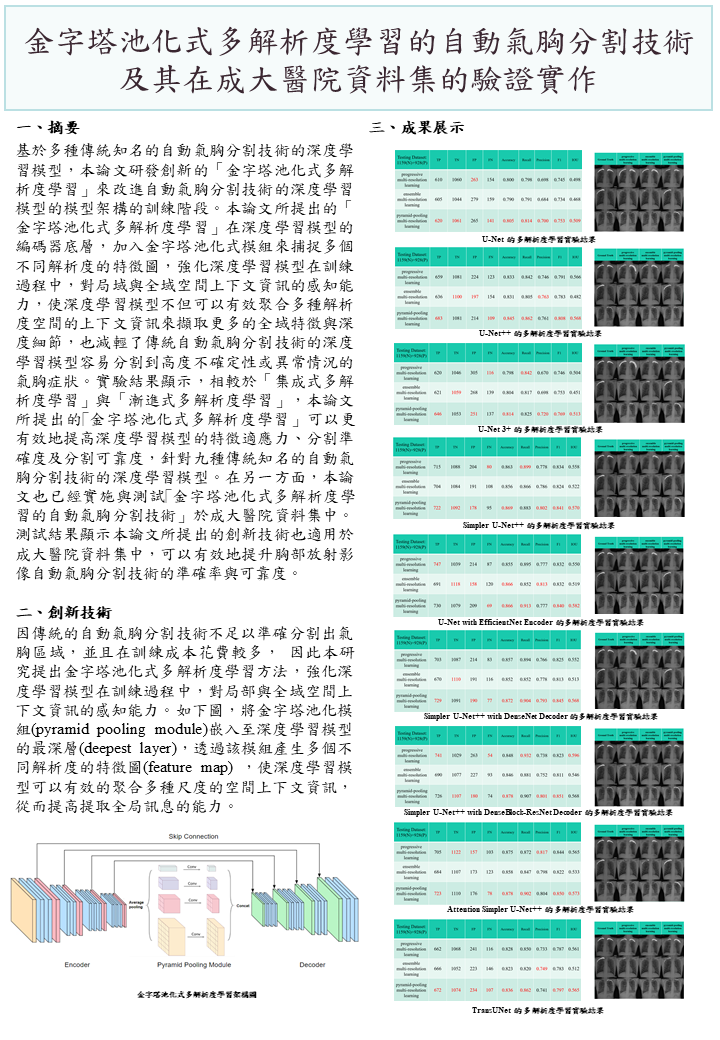 金字塔池化式多解析度學習的自動氣胸分割技術及其在成大醫院資料集的驗證實作 |